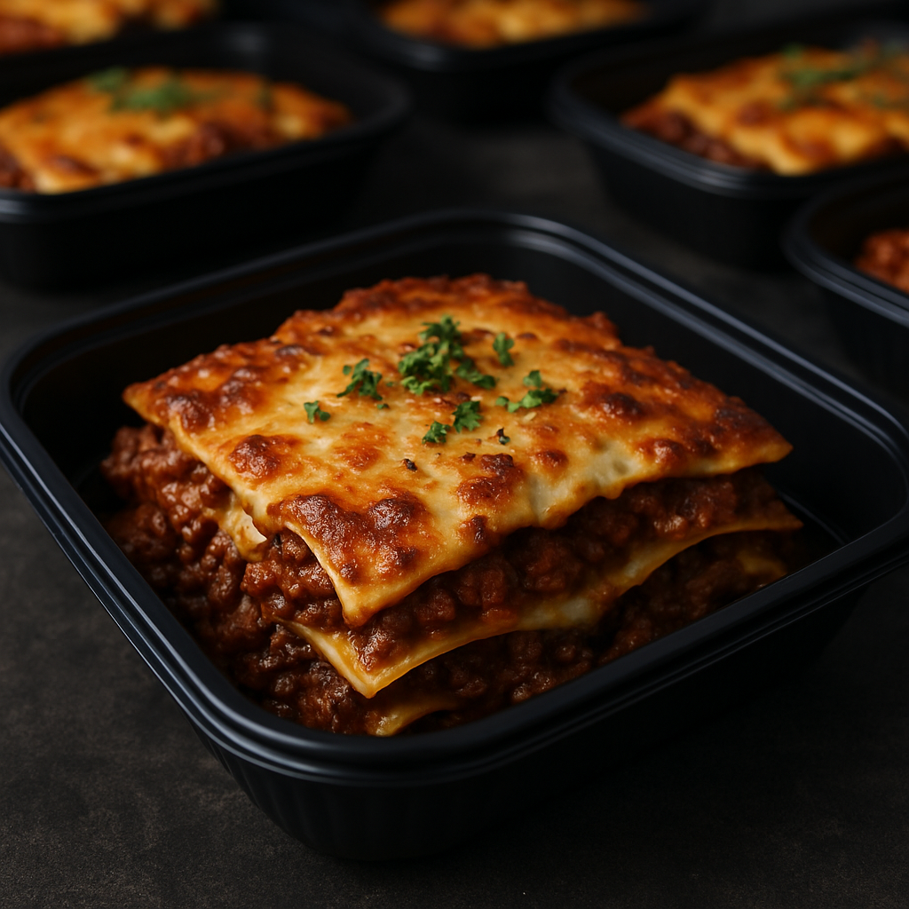 Vår generösa, hemlagade lasagne med långkokt köttfärssås, krämig bechamel och perfekt gratinerad ost.